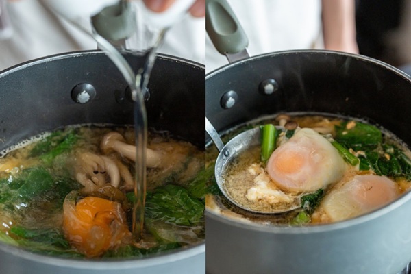 さらに卵を落とし入れ、弱火で2分程、白身が固まるまで加熱して火からおろし、器に盛り付ければ完成だ。