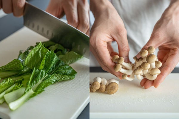 下準備として、小松菜の根元としめじの石づきを切り落としておこう。小松菜は3cm幅に切り、しめじはほぐす。