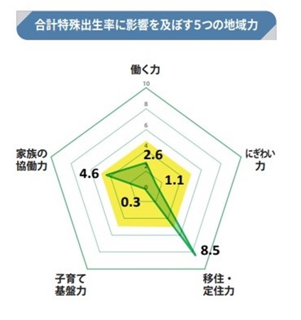 丹波山村の合計特殊出生率に影響を及ぼす5つの地域力のレーダーチャート