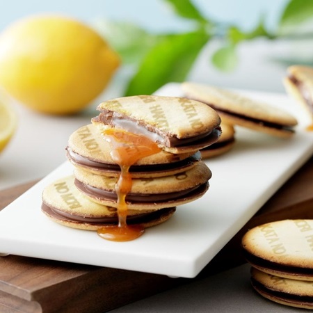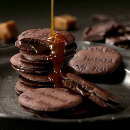 博多の森 生キャラメルサンドは福岡県内生産・加工小麦粉を使用し、サクっと洗練された食感の高級感あるお菓子。とろける生キャラメルをチョコレートで包み込み、4種類のフレーバーどれもが口に入れた瞬間に上品な香りを楽しむことができる。