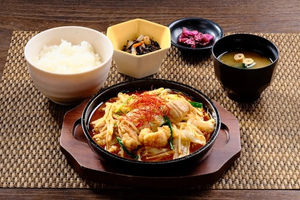 一例として、「とうがらし醤油のピリ辛鉄板ホルモン炒め定食」(1,380円)がある。極楽湯オリジナルのにんにくだれに、姫とうがらし醤油を配合。ぷりぷりの牛ホルモンと野菜と一緒にごはんと汗が止まらない味わいだ。
