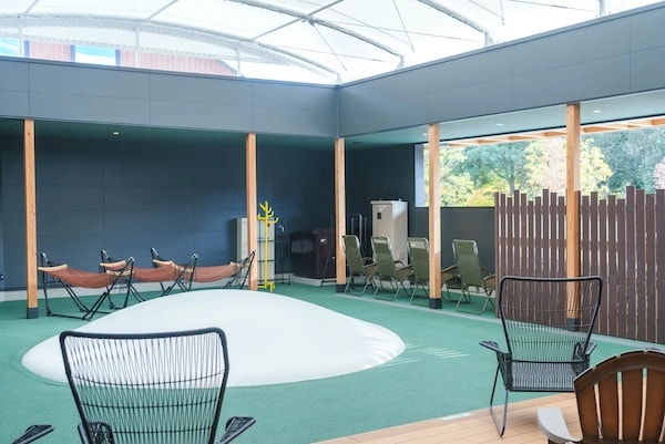 「サウナガーデン」は、男女共用のサウナを有した中庭空間。館内着で楽しめる大型サウナ室には、フィンランドHARVIA社製のサウナストーブを設置。毎日、熱波パフォーマンスやアウフグースを開催している。