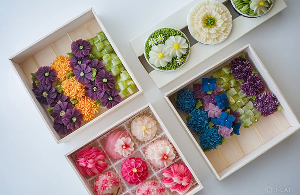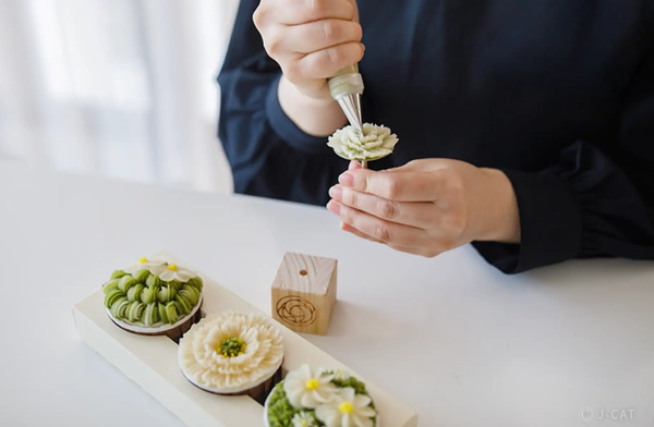 春夏秋冬の花々をモチーフに、繊細な技法を学びながら、美しい和菓子づくりを楽しむことができる。