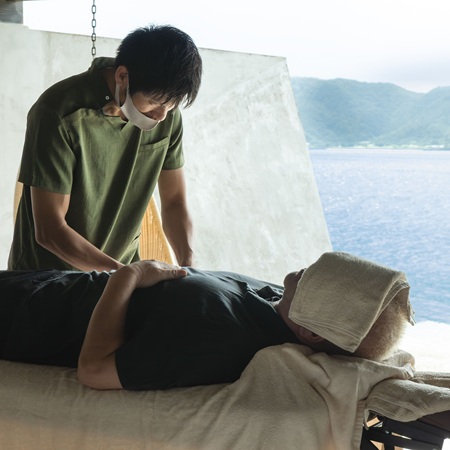 1つ目は「伝泊 The Beachfront MIJORA」がある赤木名集落の「整体ノ蔵」と連携し、客室内で整体を受けられる出張整体サービス。波音が届く静かな空間で、心と身体をゆるめるひとときを過ごすことができる。