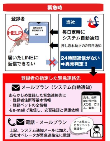 LINE通知に無反応のままN+1日(24時間)が経過することをトリガーとして、登録された緊急連絡先にペット情報を添えて飼い主連絡やペットの緊急保護等を依頼するメールを送信。プランによっては、メールに加えて電話での連絡サービスも利用可能だ。