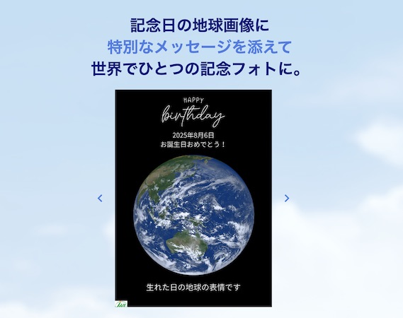 空を見上げることはあっても、自分の記念日を、地球という大きな視点から想像する機会はあまりない。あの日、地球はどんな表情をしていたのか。このサービスでは、指定の日付に合わせて、 その日の地球の姿を一枚のビジュアルとして仕上げてくれる。
