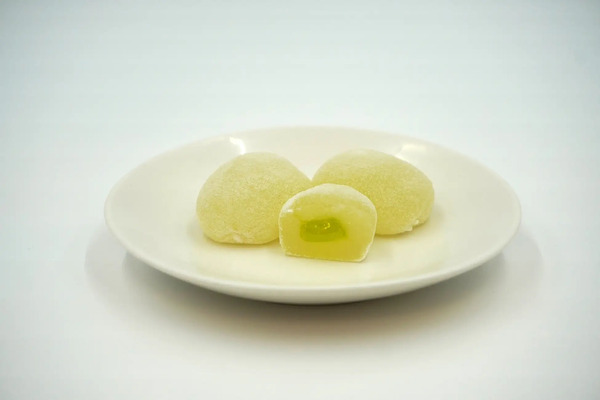 羽二重餅の製法で蒸した餅粉に、水あめや砂糖を加えて練り上げた求肥で、果物のジャムをやさしく包み込んだ、なめらかで上品な味わいが特徴だ。