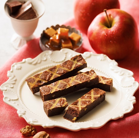 「林檎キャラメルブラウニー」5本入り・1,458円(税込)は、厳選した二種類のクーベルチュールチョコレートをブレンドした生地に、くるみと、蒸留酒に漬け込んだドライリンゴを加え奥行きのある味わいに仕上げた一品。上品な林檎の香りとほろ苦いキャラメルの絶妙なハーモニーを楽しめる。