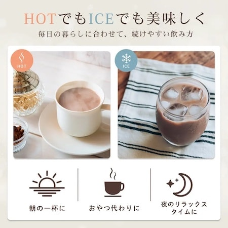 甘さを抑えたすっきりとしたココア味で、日常生活の中で無理なく続けやすい点も特徴。水・牛乳・豆乳など幅広い飲み方に対応している。