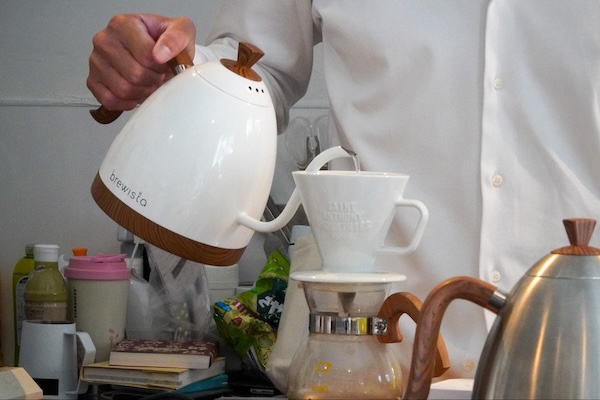 井筒さんの淹れるコーヒーは、苦味を極限までそぎ落とした浅煎り。豆を粗く挽き、丁寧にゆっくりと抽出するその一杯は、口に含むとふわっと甘みが立ち上がる。軽やかなのに、どこか輪郭がしっかりしていて、静かに余韻を残す。