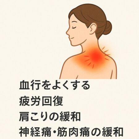 患部を温めることで、「血行促進」「疲労感の軽減」「肩まわりのリラックス」「神経痛・筋肉のこわばりの緩和」などが期待できる。