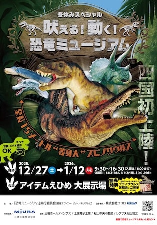 愛媛県松山市の「アイテムえひめ」では、冬休み特別企画として体験型イベント「恐竜ミュージアム」を、12月27日(土)〜2026年1月12日(月)の期間に開催する。