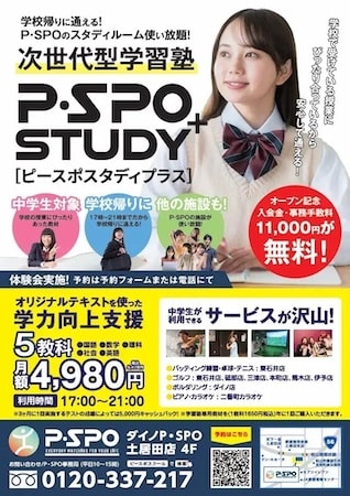 「P・SPO STUDY+」は、学校帰りに立ち寄れるスタディルームを備えた次世代型学習塾。同会場では、学習環境やサービス内容を紹介し、学びと日常を無理なく両立できる仕組みを体験できるという。