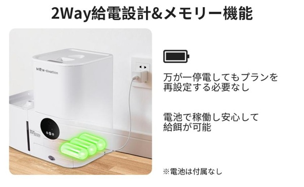 また「DCアダプター給電+内蔵大容量バックアップバッテリー」という2重の電力供給方式を採用。停電時にもバックアップバッテリーが即座に作動し、ペットはいつも通り決まった時間に食事をとることができる。
