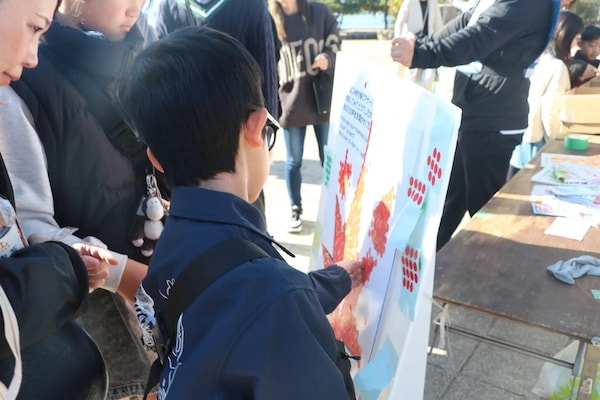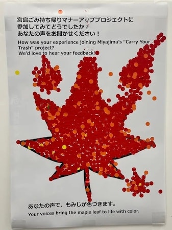 参加者からは、「テイクアウトのごみを入れる袋があって便利だった」「宮島らしい素敵な紅葉のデザイン袋で嬉しい」などの声が寄せられた。取り組みに対する印象について、参加者がシールを貼って答える形式のアンケートでは、多くの人から良い取り組みであると評価された。