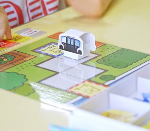 2つ目は、「トヨタ未来スクール 未来モビリティプログラミング教室」。「いっぽすすむ」「みぎをむく」などのカードを並べて「プログラミング」を作り、まちの人を助けるミッションに挑戦。同プログラムを通じて、社会課題やプログラミング技術について学ぶことで、身近な問題解決に取り組む姿勢や、よりよい社会の実現を目指す意識育成につながる。