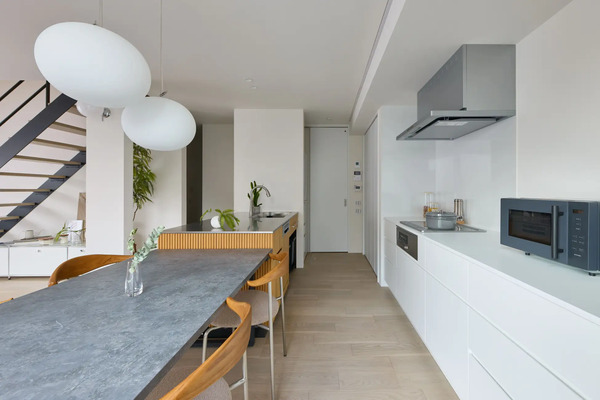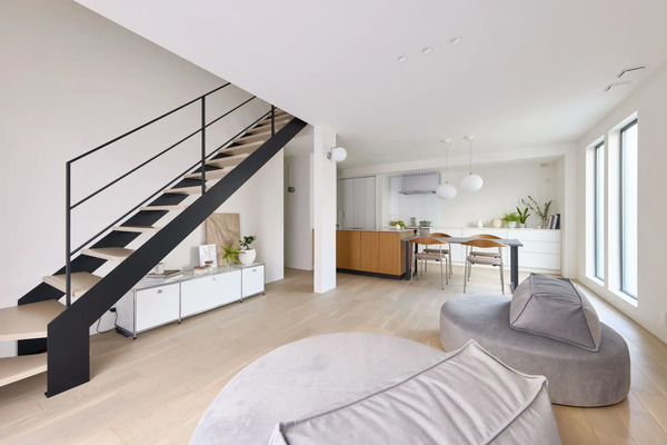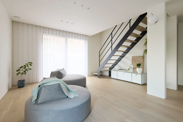 中庭を望む開放的な1階LDKは、視線の抜けと広がりを感じられる設計で、アイアン階段が空間のアクセントとなり、住まい全体にのびやかな印象を与えている。