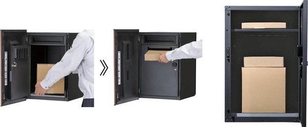 さらにフラップ構造により、施錠後も大型郵便物や小型荷物(W200×H70×D350mm程度)の追加投函も可能だ。