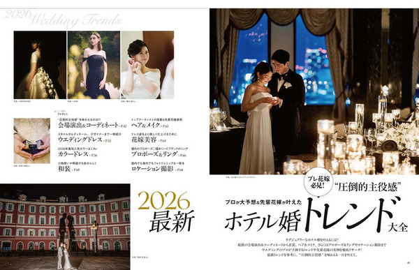 また、今号の特集では、2026年の最新ホテルウエディングのトレンドスタイルを大予想!素敵が詰まったラグジュアリーな「ホテル婚」のトレンドキーワードは、“圧倒的主役感”だ。
