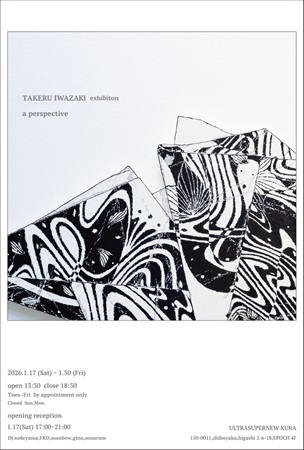 UltrasuperNewは、2026年1月17日(土)〜30日(金)の期間、TAKERU IWAZAKI氏による個展「a perspective」を「UltraSuperNew KURA」で開催する。入場料は無料だが、入場するには事前予約が必要だ。