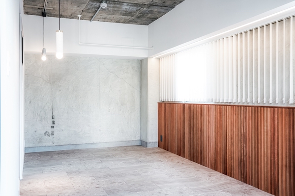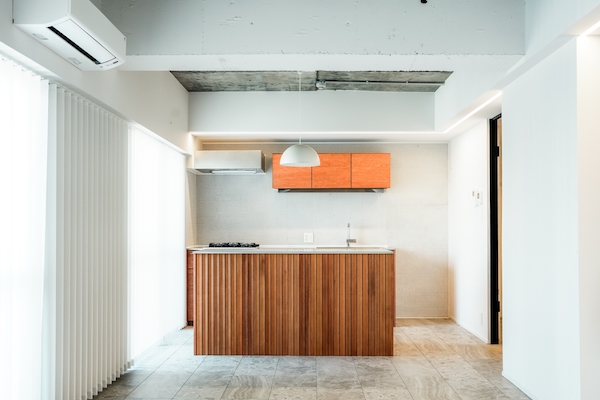 LDKや寝室の床には、近年、人気が高まっているフロアタイルを採用。洗練された印象を与えながら、手入れが簡単、かつコストも抑えられる素材だ。天井は躯体のコンクリートをそのまま活かし、インダストリアルな雰囲気に。バーチカルブラインドや木目のアクセントを組み合わせ、無機質さと温かみが調和したホテルライクな空間を実現している。