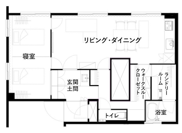 玄関は狭くて暗い印象を一新。室内窓を設けることで、広がりと光を感じられる心地よい空間に仕上げた。また、帰宅後すぐに手洗いができるよう洗面台を設置。さらに、リビングへ直行できるルートとは別に、ウォークスルークローゼット(WTC)を経由する回遊動線を実現。上着や荷物を収納してからリビングへ向かうこともできる。