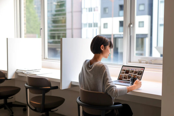 モニター付きの半個室席を豊富に備え、仕事に集中したい場面にも快適に対応。大切なPCや書類を安心して保管できる個室席のプライベートオフィスも備えている。