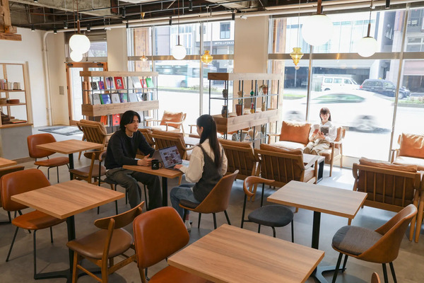 1Fは、こだわりのドリンクやスナック、パンが用意され、気分転換や会話を楽しめるオープンなスペース。用途や気分に合わせて選べる多様な席があるので、思い思いの時間を過ごせる。