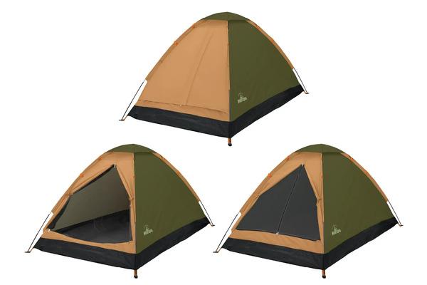 「組立式2人用ドームテント」¥4,980(税込)は、ポール2本の簡単構造なので1人でも短時間で設営可能。フルオープン・メッシュクローズ・フルクローズの切替えができるのでシーンに合わせて開閉することができる。