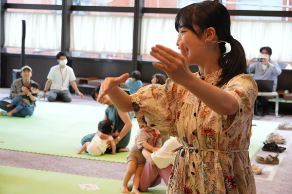 うたのおねえさんと一緒に、リトミックやふれあい遊び、歌も交えた絵本の読み聞かせなど、綺麗な歌声と楽しい物語に囲まれて、みんなでニコニコ笑顔の時間を過ごしている。