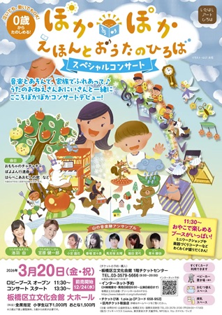 板橋区文化・国際交流財団は、0歳から参加できる親子向け音楽事業「ぽかぽか☀えほんとおうたのひろば スペシャルコンサート」を、3月20日(金・祝)、板橋区立文化会館の大ホールにて開催する。