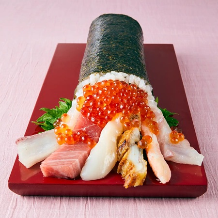 鮮度とボリュームが自慢!魚屋の恵方巻「豪華海鮮 特別恵方巻」は、中トロ・鯛・カンパチ・ホタテ・うなぎ・カニ・イクラと、目利きが厳選した豪華なネタを豪快に巻き上げたメニュー。どこからかぶりついても幸せがあふれる贅沢な恵方巻となっている。