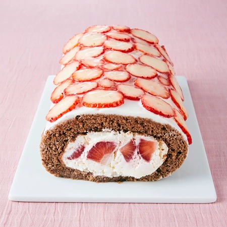 節分を締めくくるデザートに!スイーツ恵方巻「あまおういちご 特別恵方巻」は、中身にたっぷりの“あまおういちご”と38%の純生クリーム、スポンジにセイアグリー健康卵やオランダ産ココアを使用。さらに“あまおういちご”を表面にちりばめた贅沢スイーツだ。