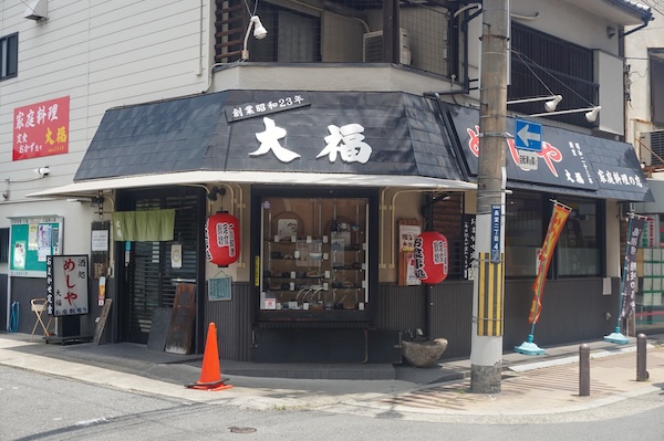 布施駅の北側。「お食事処 大福」は、昭和23年からまちの胃袋を静かに支えてきた、町の食堂。入り口ののれんをくぐると、ショーケース越しにだしの香りと目玉焼きの音がふわりと届く。