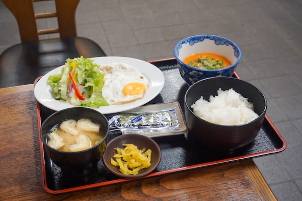 のれんが揺れるのは、朝9時。「朝ごはん定食」は、ごはんと味噌汁に、目玉焼きと小さな小鉢。