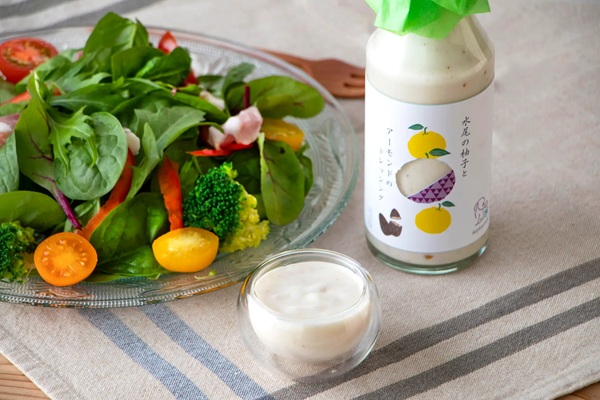 「水尾の柚子とアーモンドのドレッシング」は、京都・水尾産の柚子が持つ爽やかな香りと、アーモンドの食感が調和。後味はすっきりとしながらも、奥行きのある風味に仕上げられている。