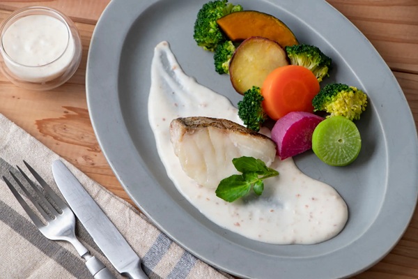 水尾の柚子とアーモンドのドレッシングと白身魚のポワレ温野菜添えといったメニューも味わってみて。