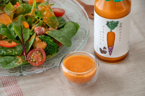 「金時にんじんとアーモンドのドレッシング」は、金時にんじんの自然な甘みと鮮やかな色合いに、アーモンドの食感をプラス。素材の甘さを活かした、まろやかで満足感のある味わいとなっている。