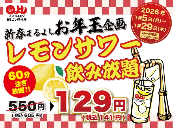 大阪市内16店舗の飲食店を展開するMRホールディングスが運営する「焼肉ホルモンまるよし精肉店」では、1月5日(月)〜29日(木)の期間、新春お年玉キャンペーン「レモンサワー飲み放題129円」を実施している。