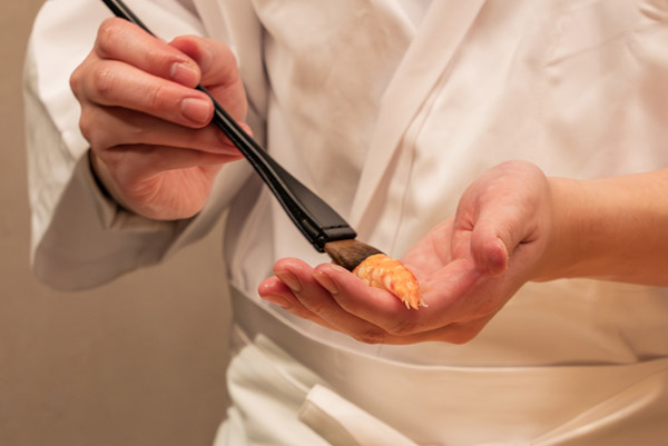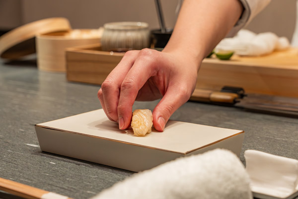 素材に応じて寝かせ、締め、温度、包丁を細かく調整し、コース全体の流れの中で一貫一貫を提供する。