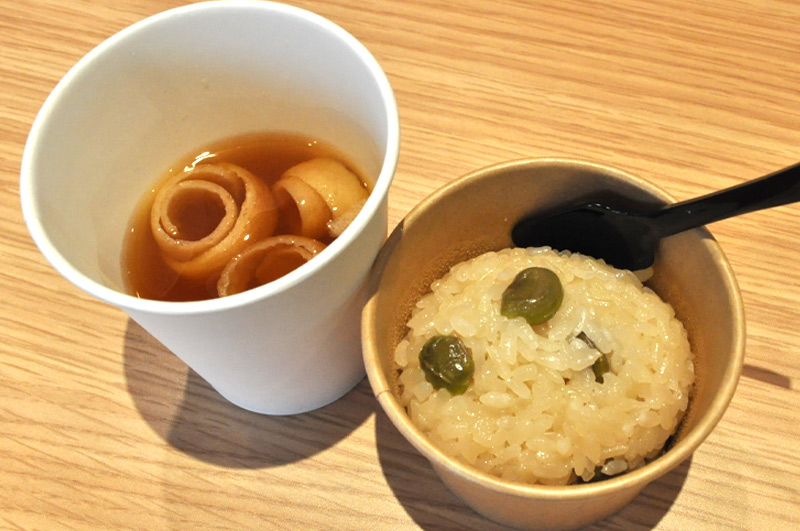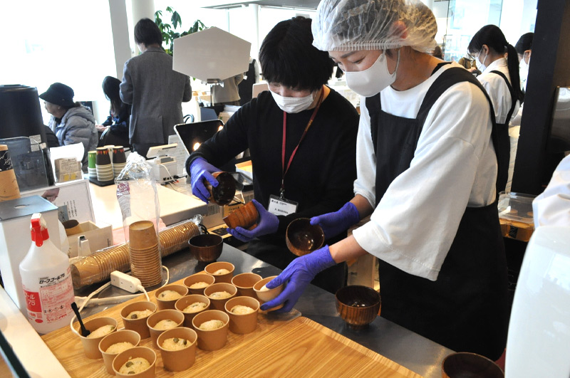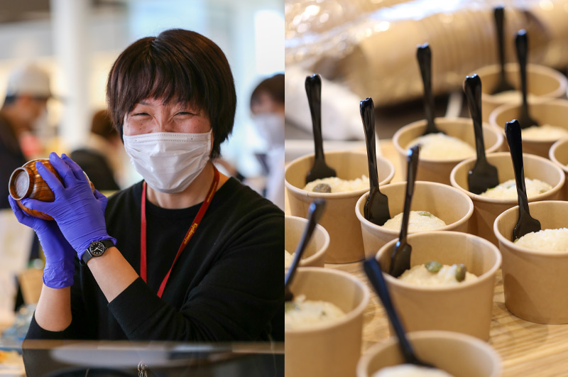 トークイベントで、山形・庄内の風土に育まれた食の物語を聞いた後に食べるおこわの味は、きっと格別・・その味わいをこの場に来てくださった皆様と共有したい!共に受賞を喜びたい!そんな思いで、スタッフ総出で、ほくほくに蒸かしたおこわを、お茶碗を使って可愛いサイズのおにぎりに!