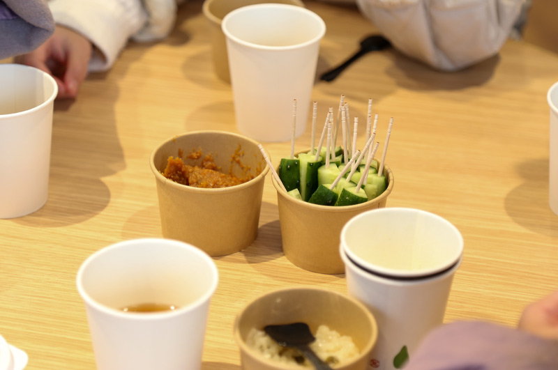 さらに今回は、お味噌汁だけでなく「はら合わせみそ」そのものの味を楽しんでもらえるよう、冷やしキュウリもご提供! お味噌汁とはまた一味違う、素材を引き立てるお味噌の味わいに、こちらも「美味しい!」と大好評でした。