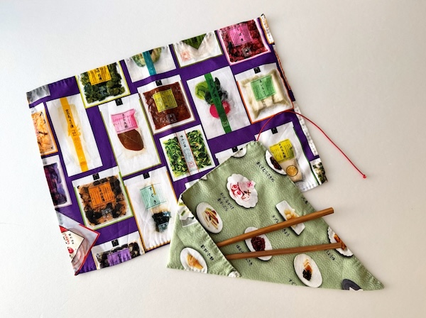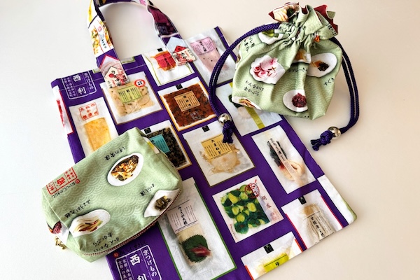 「巾着バッグキット」は、表布・裏布(各 約タテ30㎝×ヨコ60㎝)、コード約70㎝×2本、ループエンド2個、作り方の紙がセットで、1,000円(税込)。ノムラテーラー四条店・寺町店のほか、京つけもの西利の本店および祇園店でも販売される。