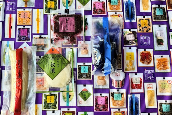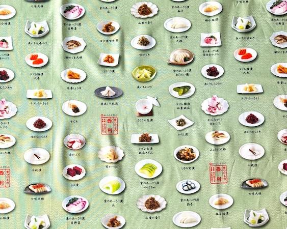 京漬物の代名詞である「千枚漬」をはじめとしたたくさんの漬物が名称付きでデザインされた柄と、
