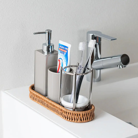 洗面所では、ハンドソープや歯ブラシをまとめて収納。樹脂だから、自然素材特有のササクレも気にならず、水回りでも安心使用することができる。