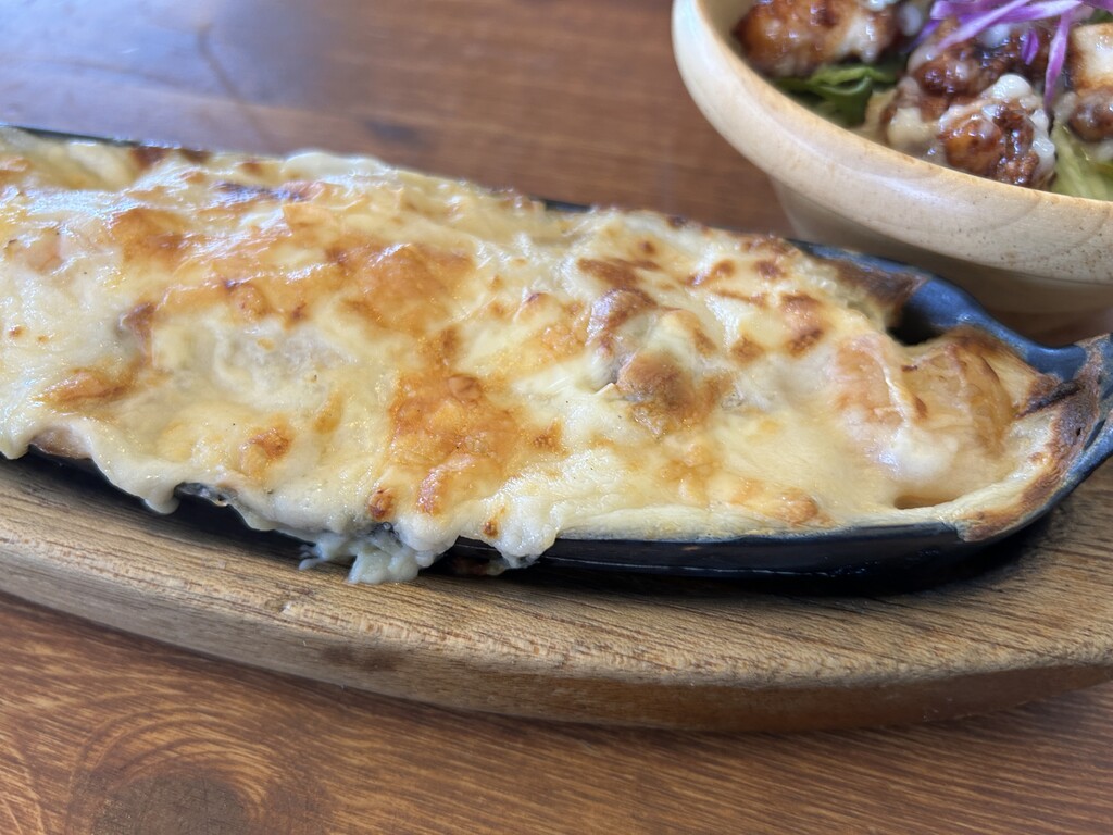長細い鉄板に乗ったマイルドなベシャメルソースの