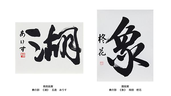 「書の部 教育長賞《湖》五島ありす氏」、「書の部 館長賞《象》岡原柊花氏」、