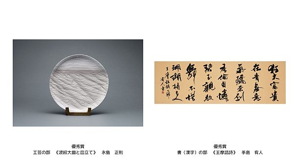 「工芸の部 優秀賞《波紋大皿と皿立て》永島正則氏」、「書(漢字)の部 優秀賞《王摩詰詩》手島宥人氏」、