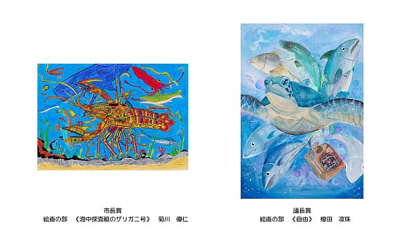 「令和7年度入賞作品 ジュニア部門」は、「絵画の部 市長賞《海中探査艇のザリガニ号》菊川優仁氏」、「絵画の部 議長賞《自由》榎田凛珠氏」、