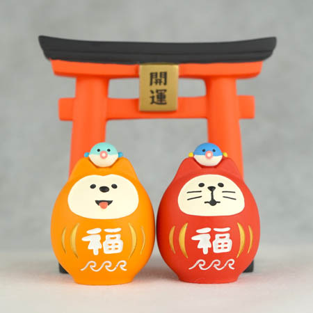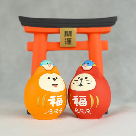 頭に「福」を乗せた「福柴だるま」と「福猫だるま」
